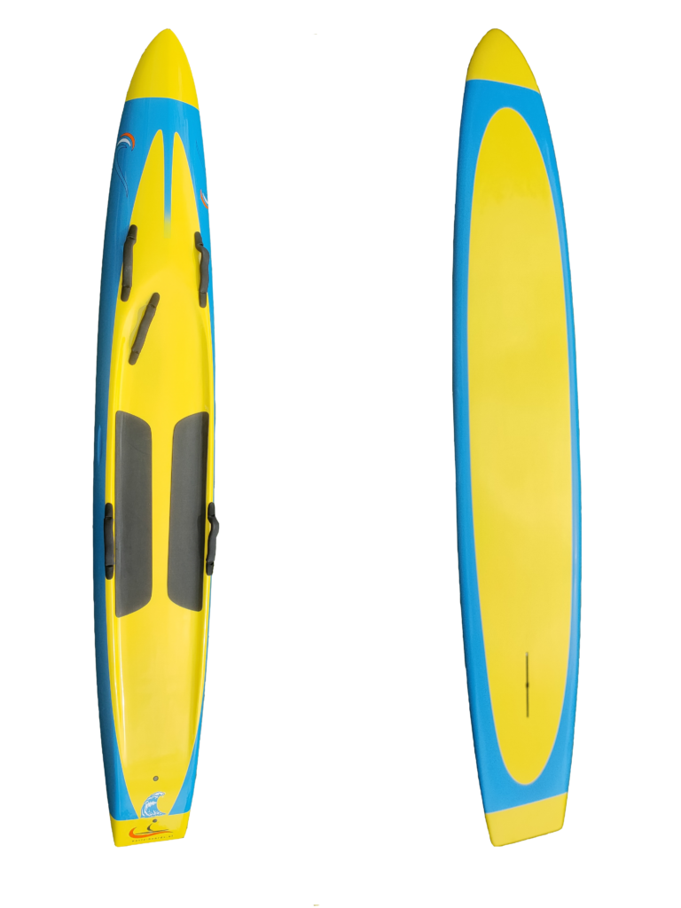 Het board is aan beide zijden voorzien van een verzonken handvat om het board makkelijk op te pakken. In totaal 5 handvatten, 2 voor, 2 achter en een extra handvat om makkelijk naar de finish te rennen.